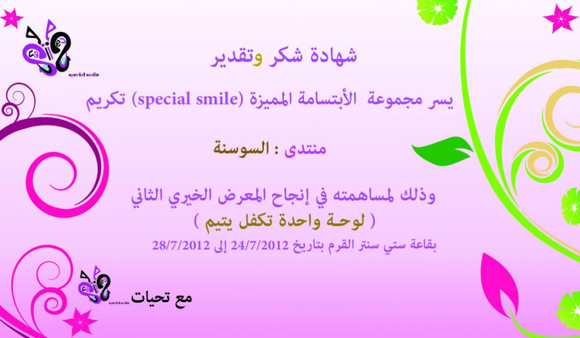 يسرنا نحن..مجموعة سبشل سمايل أن نتقدم لك بخالص الشكر ووافر الامتنان على ما بذلت من جهد وتحملت من مشقة جعلها الله في موازين حسناتك .. ونحن العارفين بفضلك المستضيئين بقدرك العاجزين عن القيام بالشكر .. وقد حررنا هذه السطور بلسان الامكان لا بقلم التبيان ... سائلين المولى عز وجل أن يجعلنا وإياك من أهل القران .. وأن يرزقنا وإياك الفردوس الاعلى من الجنان ، وصدق الله إذ يقول { هل جزاء الاحسان الا الاحسان }